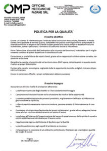 La qualità dei pezzi prodotti viene perseguita da una continua evoluzione tecnologica, dalla formazione del personale e dall’aggiornamento dei mezzi di produzione. Ci distinguiamo per la lavorazione di piccole e medie serie, garantendo flessibilità, affidabilità e un controllo qualità rigoroso. Investiamo costantemente in tecnologia avanzata, formazione del personale e innovazione produttiva per offrire soluzioni su misura e performance elevate.
