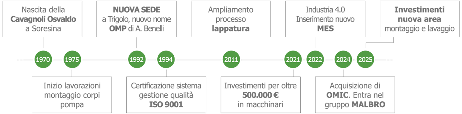 La storia di OMP inizia nel 1970 a Soresina (CR), con la fondazione di Cavagnoli Osvaldo snc. Fin dai primi anni, l’azienda si distingue per l’attenzione alla qualità e nel 1975 la crescente domanda porta all’apertura di un nuovo stabilimento: qui prendono forma le prime lavorazioni dei corpi pompa freno e viene avviata la prima linea di montaggio.